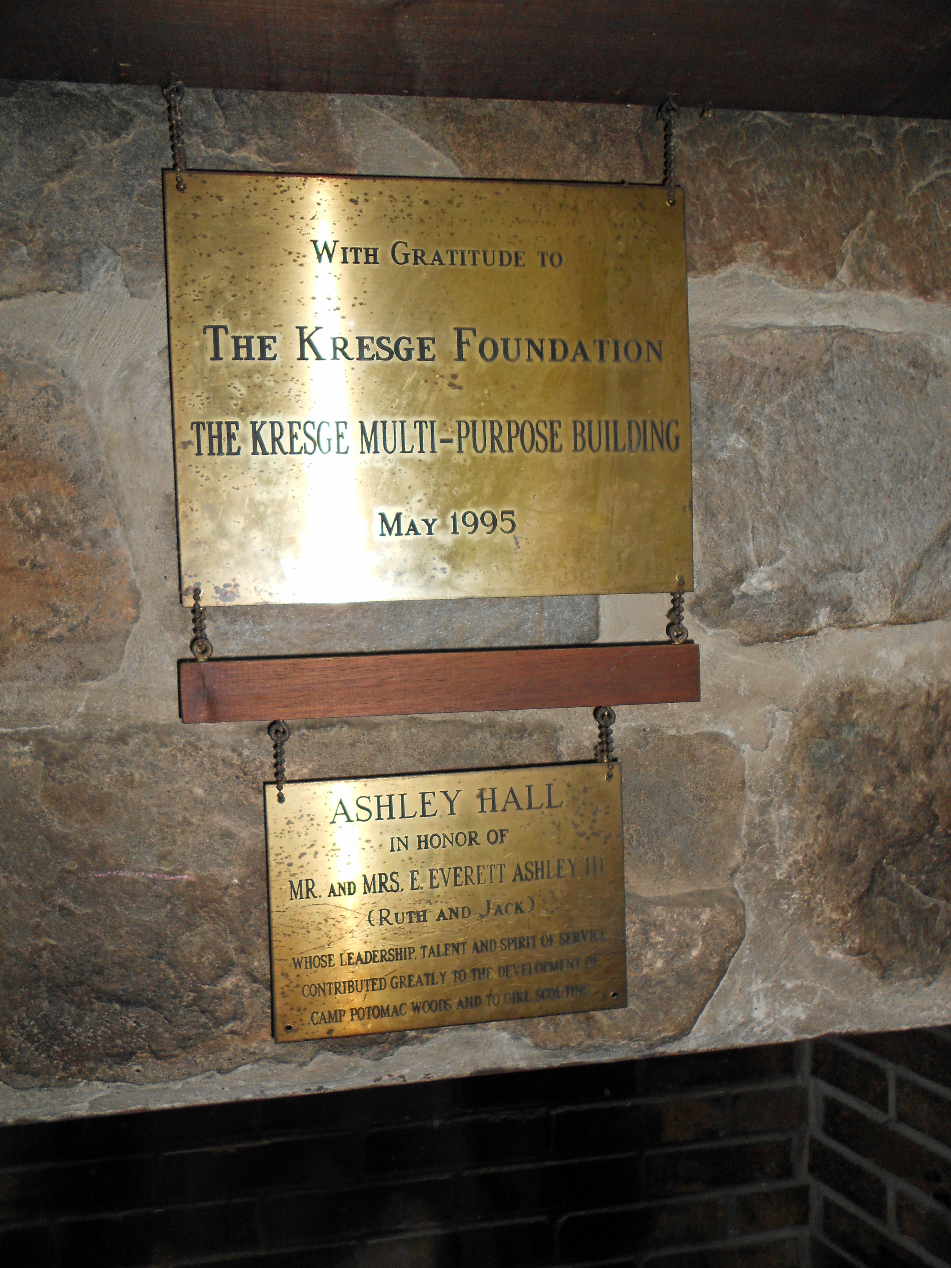 A plaque on the fireplace commemorates the rededication of the building in May, 1995 as the Kresge Multi-Purpose Building.