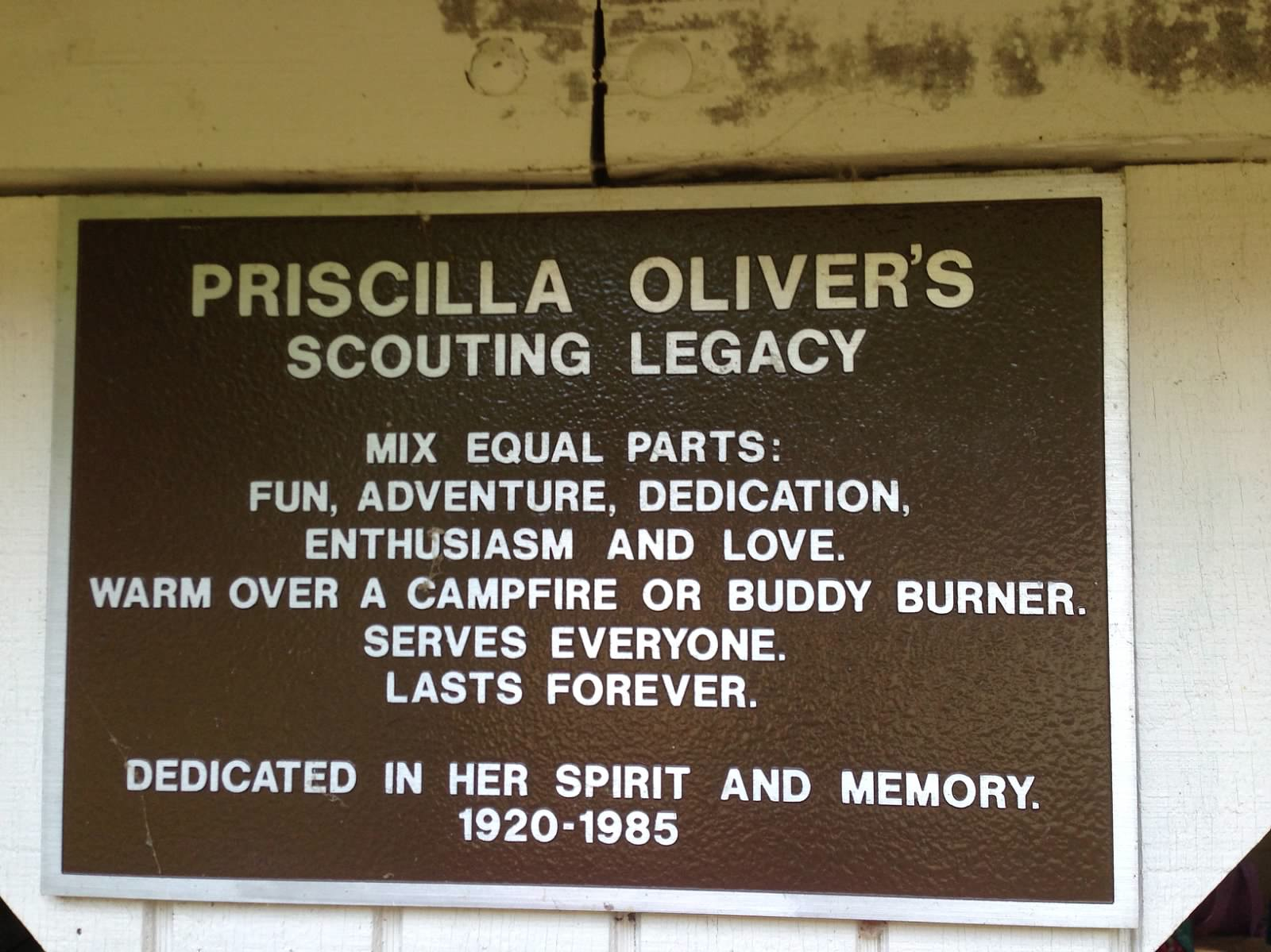Longtime Girl Scout leader Priscilla Oliver of Purcellville, Virginia, was instrumental in getting Girl Scouts started in Loudoun County. She was a troop leader besides holding many other positions, and was very much an outdoorsy woman. After her death in 1985, a memorial trail was created in her honor at Camp Potomac Woods. Named Priscilla's Trail, it is one of the many hiking trails that run through Camp Potomac Woods.